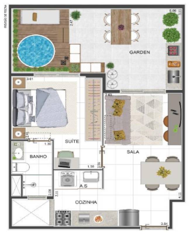 O apartamento estilo garden, com previsão de teto vinilínico, piso em porcelanato, tomadas USB, automação de cortinas no quartos e na sala e infraestrutura para equipamentos tecnológicos.