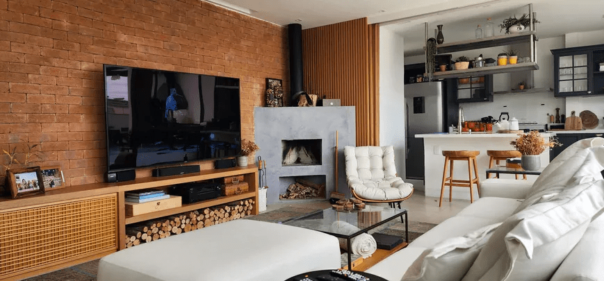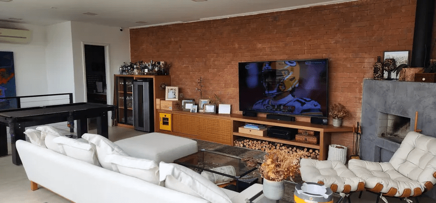 2⁰ PAVIMENTO: Salão 2 ambientes com lareira oferecendo um charme especial ao ambiente. Cozinha aberta para a sala, estilo clássico, com coifa, despensa e muito espaço de armazenamento projetado sob medida. Lavabo e ampla área externa.