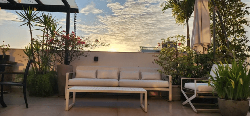 ÁREA EXTERNA: Espaço gourmet coberto, com forno a lenha e autêntica parrila argentina instalados. Lounge ajardinado com ombrelone para os dias de sol. Piscina aquecida.